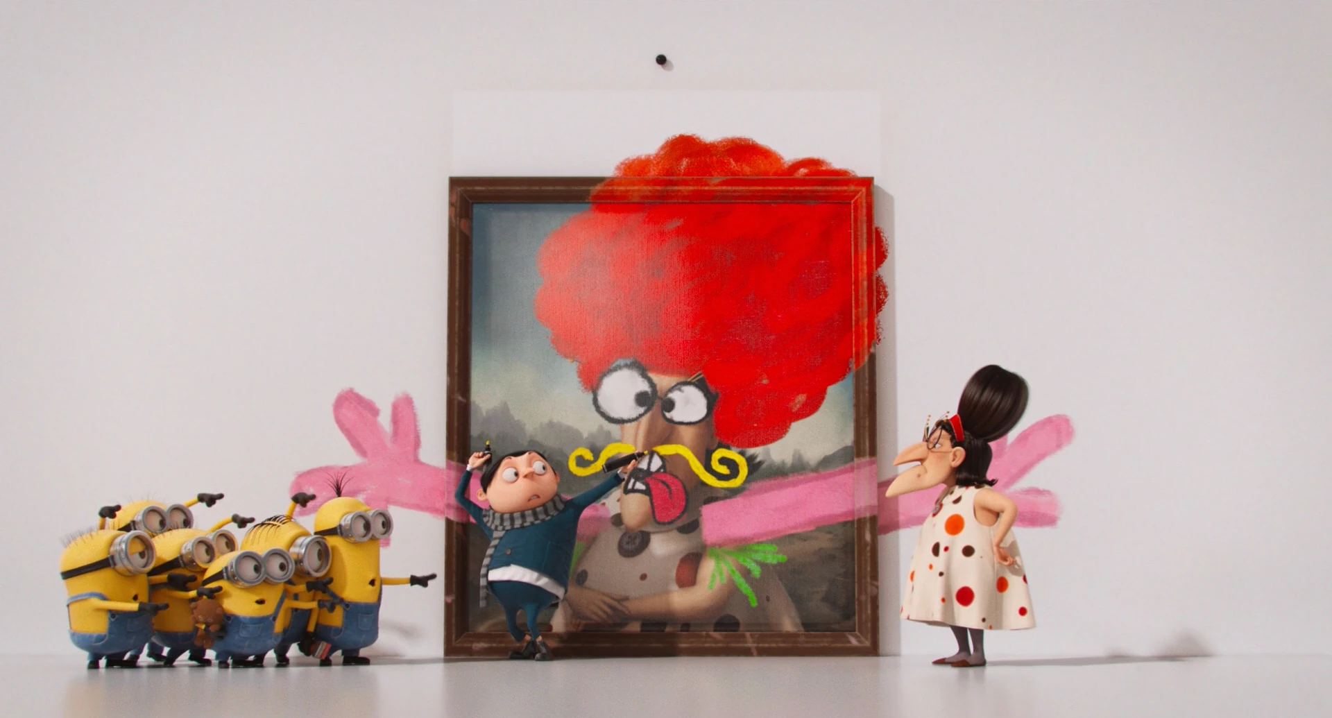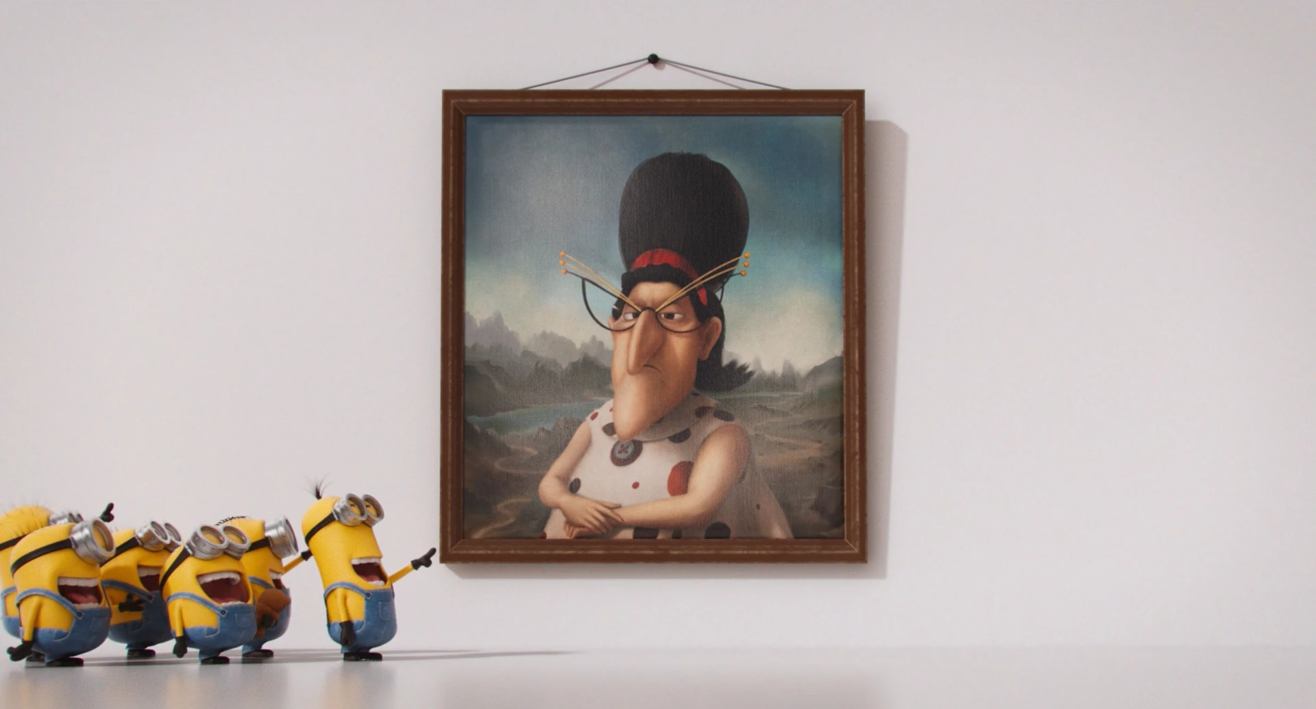 Так же есть сцены во время титров. Миньоны подходят к картине с изображением Марлены она как мона Лиза. Кевин показывает пальцем на портрет и все начинают смеяться, после чего убегают. Дальше следует сцена того, как миньоны разрисовывают этот портрет, но выходит сердитый Грю, смотрит на картину и внезапно подрисовывает усы желтым цветом. Миньоны начинают смеяться, а Грю корчить рожицы. В это время Марлена подходит к портрету,