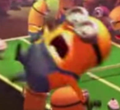Leon was seen in the ice cream party trying to carry some glass cups down. However, another minion barges into him, which causes him to fall and drop his cups. he was seen as an evil minion as well.