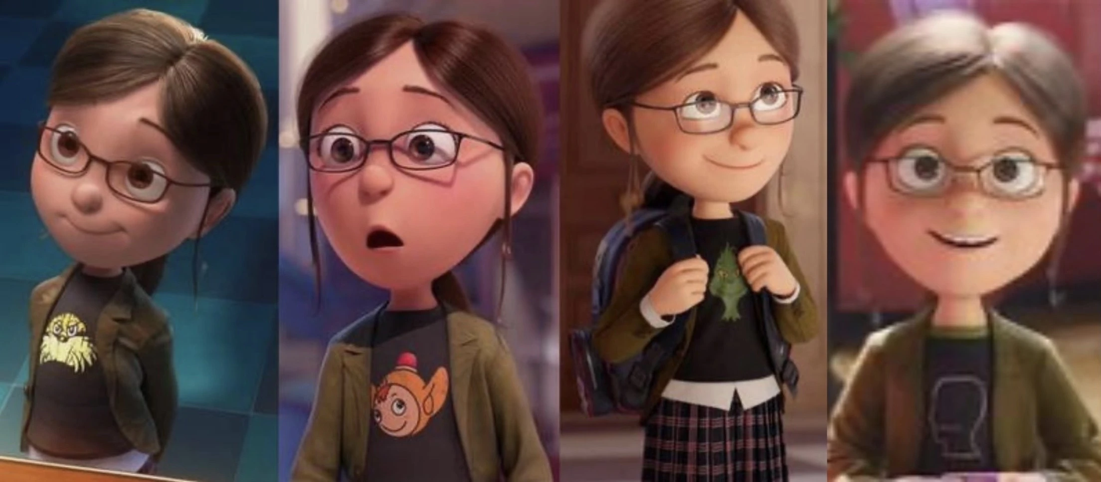 She is seen wearing a black T-shirt (pale blue in Universal Studios parks) (with a green line on the collar in Despicable Me 4) with a white button shirt underneath it, a faded green jacket, a navy and purple plaid skirt with white socks and a pair of red and white striped hi-top Converse sneakers.