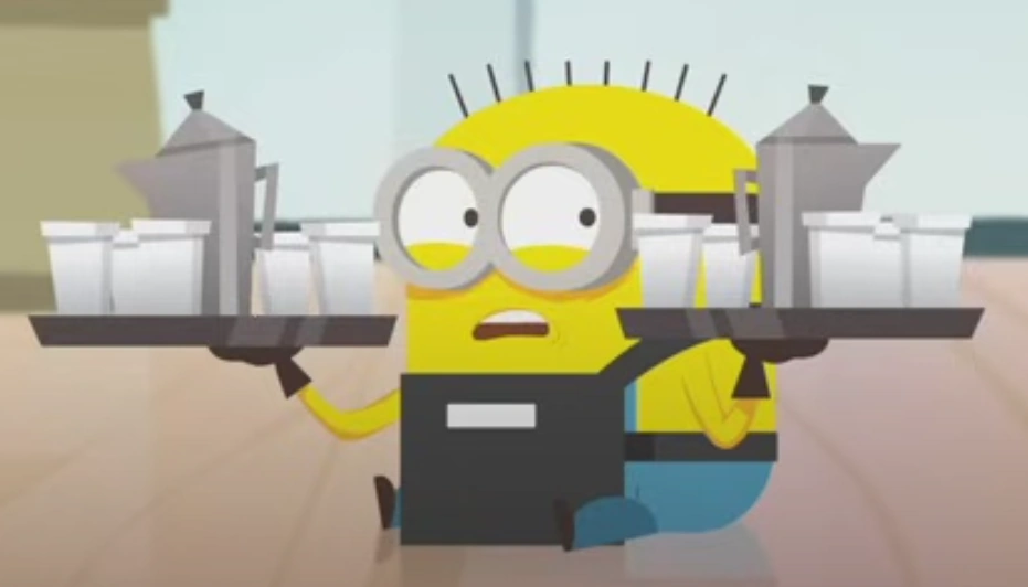 While Nolan was mopping the floor, Patrick carried coffees to serve but he was slipping and nearly dropped them. Since no minion was in their seat, Nolan launched Patrick like a cue ball and got them to their seats.