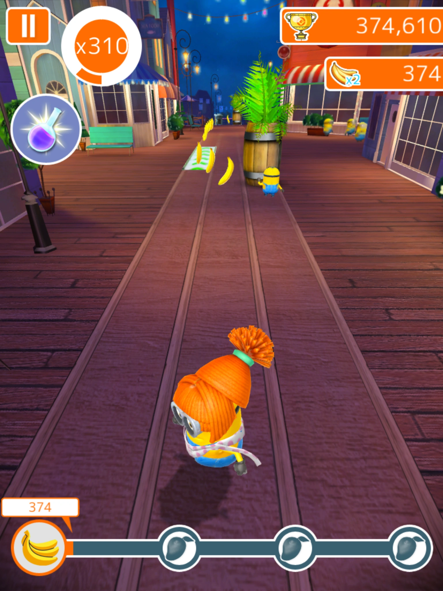 In the location, the scenery is a bustled streets located in a pier in night. The minion needs to jump over bollards and red fences as small obstacles while dodge billboards, surfboards, barrels of plants and ice cream carts driven by Minions as high obstacles.