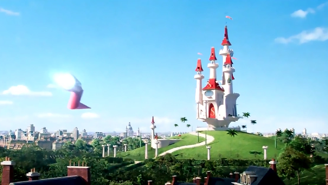 The castle is painted white with four towers, all with red roofs, the main roof as well the doors have the letter "S" on them. The castle itself is delimited and surrounded by a white stone wall.
