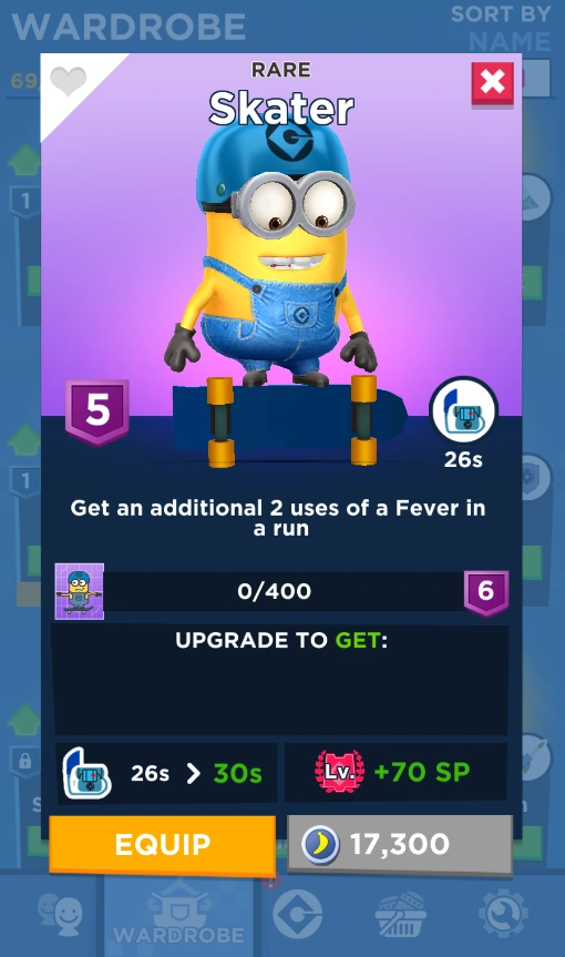 The Skater Minion Costume is a playable character in Minion Rush. It costs 50 costume cards and 1 coin to unlock or can be won in occasional bundle offers in the Shop.